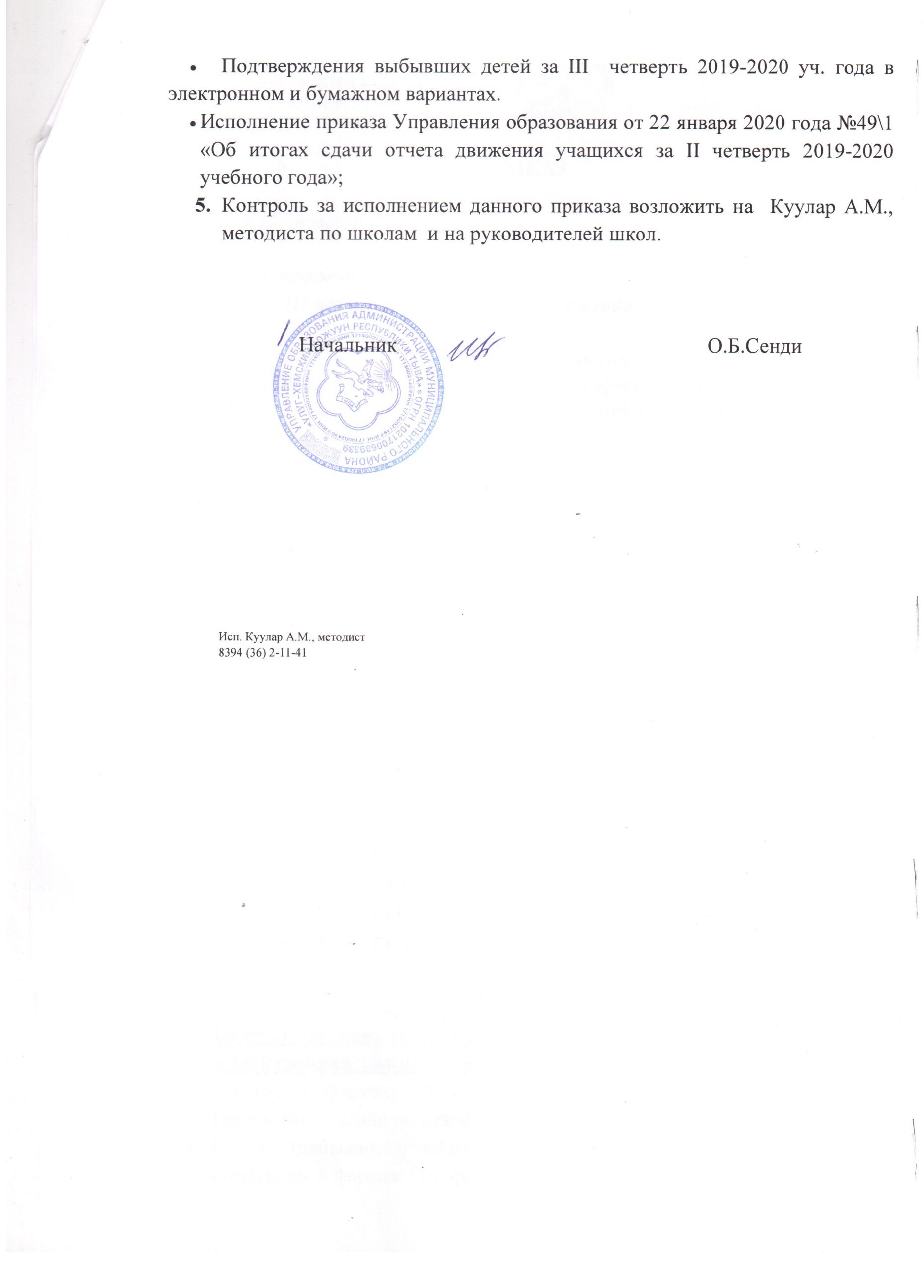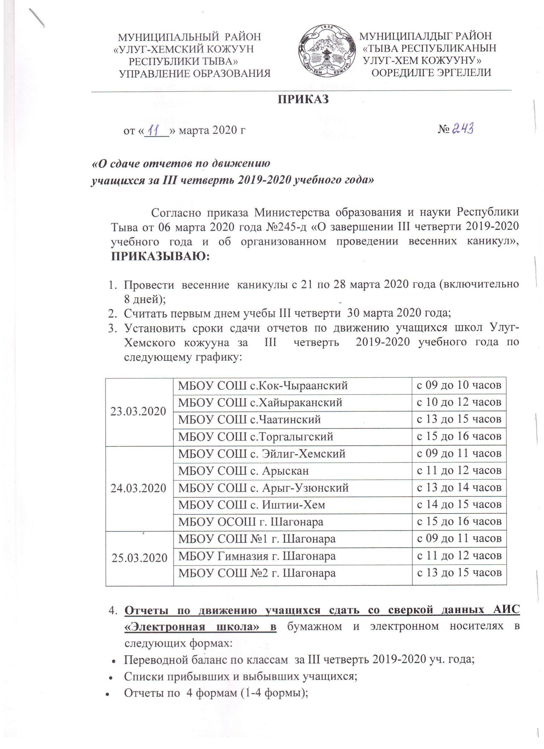 Новости Весенние каникулы 22.03.2020 / Приказ о завершении 3 четверти 2019-2020 учебного года и об организованном проведении весенних каникул № 243 Приказ-о-сдаче-отчетов-за-3-чСкачать 2-стр-приказа-о-сдаче-отчетов-за-3-чСкачать О внесении изменений в приказ УО Приказ №272Скачать