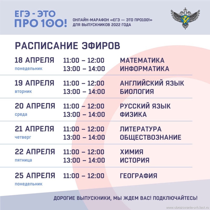 Новости «ЕГЭ — это про100!» 13.04.2022 / 18 апреля стартует онлайн-марафон «ЕГЭ — это про100!» для выпускников 2022 года. Трансляции будут проходить в официальных аккаунтах Рособрнадзора:ВКонтакте https://vk.com/rosobrnadzorRutube https://rutube.ru/channel/25110944/